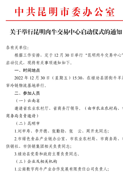 2023年新年伊始,云南省再生经济产业开发研究会(下称“研究会”)根据研究会与丽江市旅游投资有限公司签订的合作协议,为进一步共同推动黎明景区老君山乡村振兴工作,遵照国家乡村振兴局、民政部国乡振发[2022]5号关于《社会组织助力乡村振兴专项行动方案》的通知及云南省社科联“我为群众办实事”的总体要求和部署,为贯彻落实云南省政府“菌草办”的指示精神,结合我会在昆明市委办2022年12月30日在禄劝举办的“昆明肉牛交易中心”启动仪式上,与昆明市肉牛交易中心、昆明市肉牛产业协会和云南数字肉牛产业合作发展有限责任公司达成的合作意向,决定助推会员企业在云南大力发展农牧业项目。