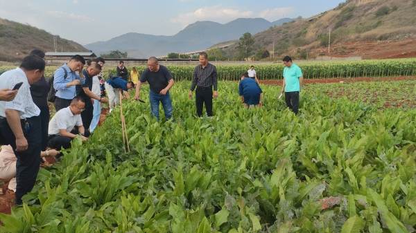 省社科联学会部主任张晖、二级调研员卜金荣、三级调研员李晓健,红河州社科联主席吴华昊、办公室副主任朱董,红河州社科院副院长吕涛,开远市委常委组织部长许逵、市人大副主任施厚光、市政府副市长姜芳、市文联(社科联)主席宋佳佳、副主席代一颖,云南省再生经济产业开发研究会会长杨荣华、咨询专家刘乔光巡视员,云南天联集团董事长沈立虎、 云南爱姆特农林科技发展有限公司总经理李军泉和省级社科学术12家社团,即:云南省再生经济产业开发研究会、云南省高原特色农业发展促进会、云南省东南亚研究会、云南省社会发展促进会、云南客家文化研究会、云南省产业发展研究会、云南省纪实文学学会、云南省生态文明建设研究与发展促进会、云南庄园经济研究院、云南妇女扶贫协会、 云南省土地资源可持续利用促进会、云南省统计学会等二十多位专家,一道前往开远市乐白道街道办事处阿得邑村委会清塘子小组红河清涟农业发展有限公司,对大叶蛋白芽进行现场称重测试并授牌。